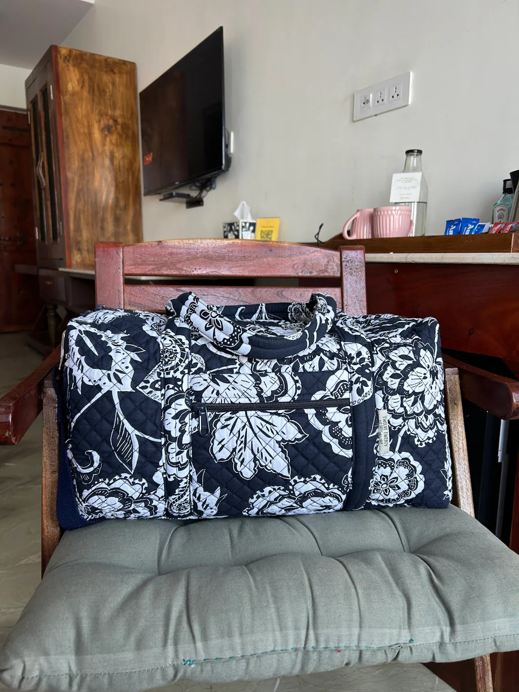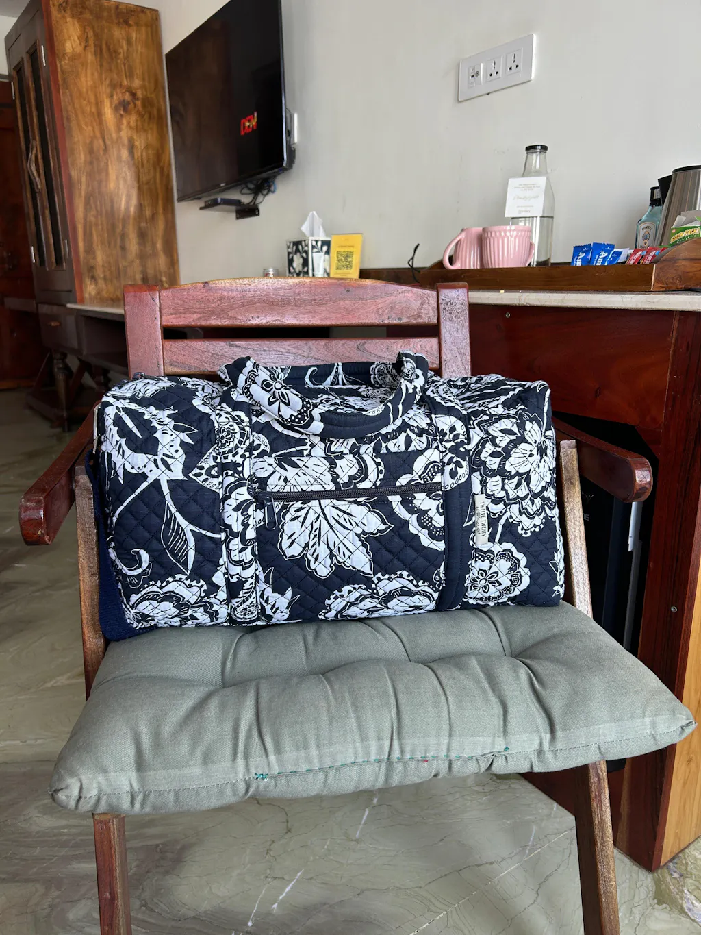 Going home for a long weekend or out on an adventure getaway? This quilted cotton Duffle helps you pack it all in style. With interior pockets to keep cosmetics, wallet, and socks organised. Exterior pockets for quick access to boarding passes, snacks or books. It’s your perfect travel companion!