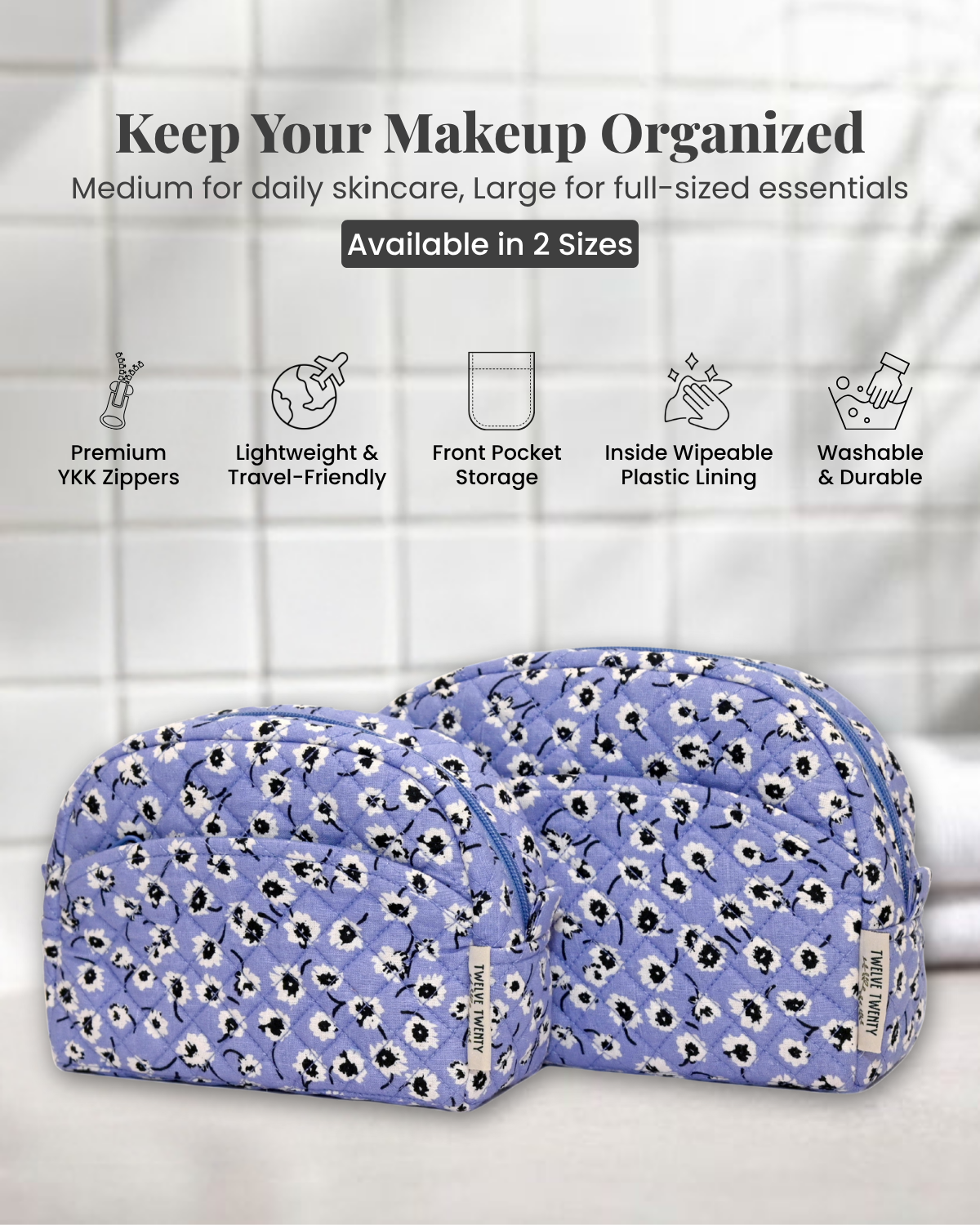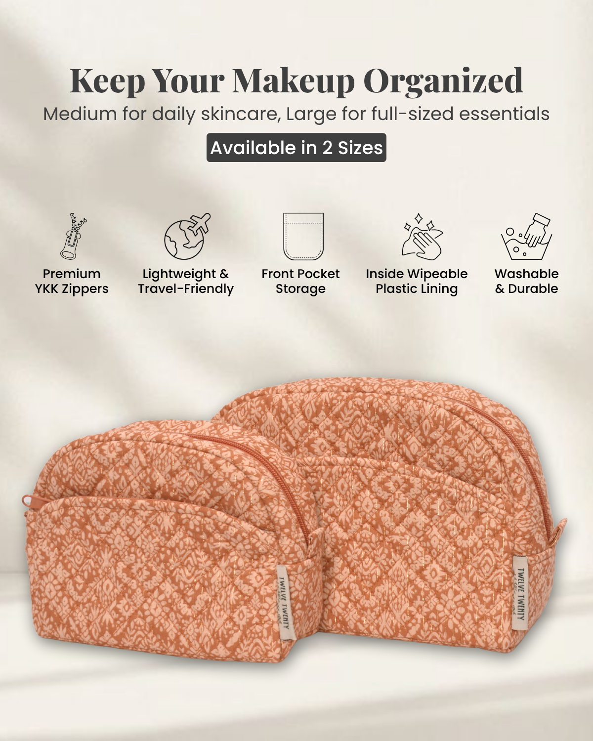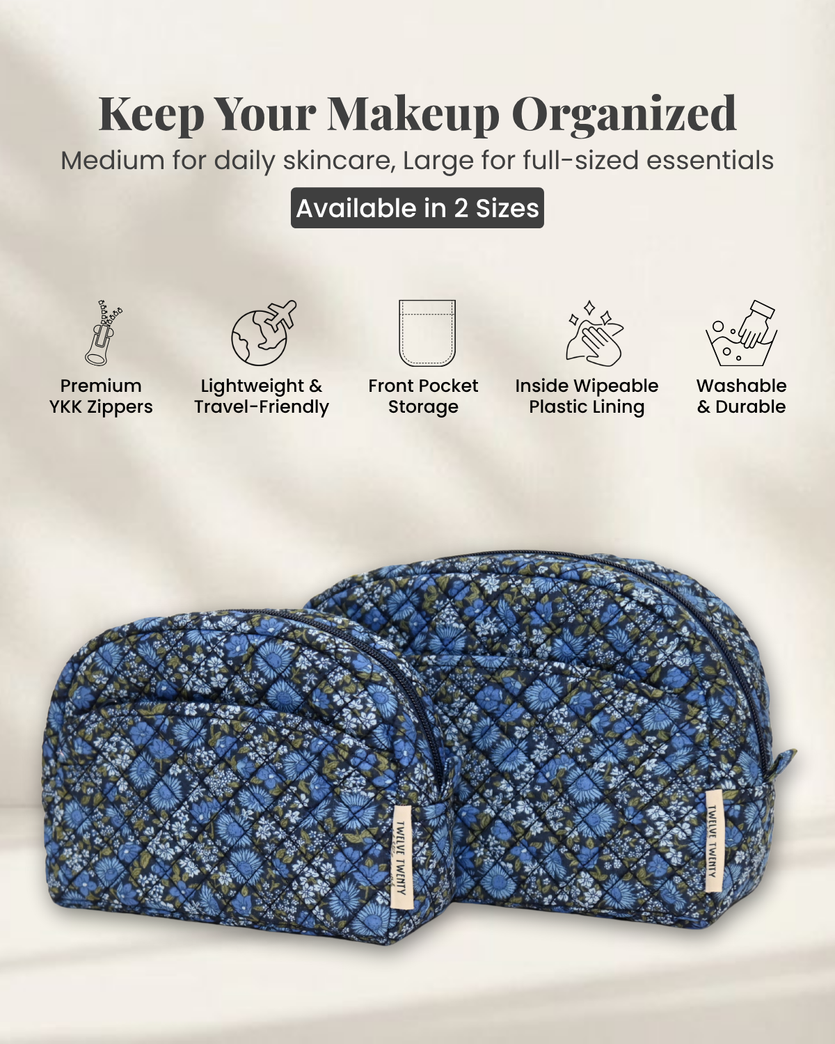 Comes in a set of 2 (1xMedium & 1xLarge) Makeup/ Vanity bags. Lined with a transparent plastic layer; any spillage can be wiped away easily. Carry all your makeup or skincare essentials effortlessly with our stylish and practical toiletry bags for women.