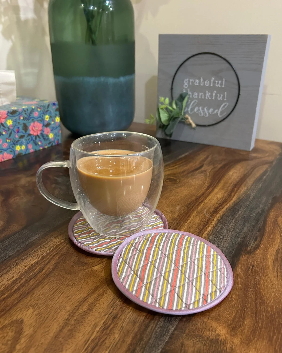 Protect your furniture with this colorful coaster set. They add a fun vibe to your party while also safeguarding your furniture from condensation created by cold drinks.