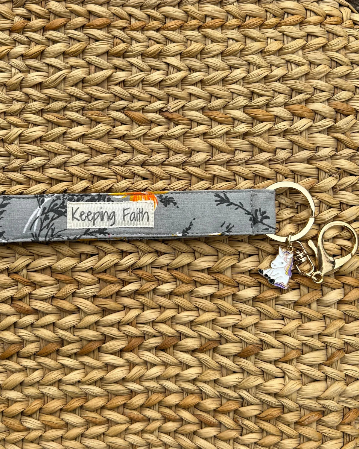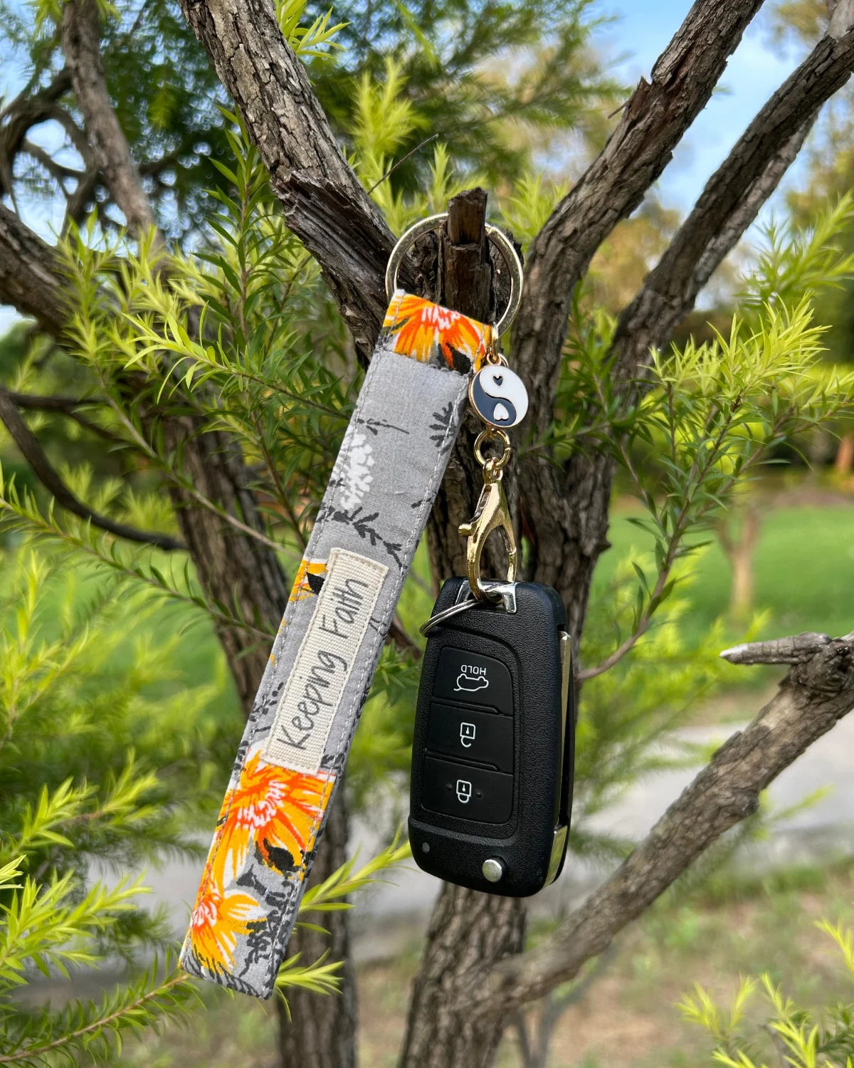 This colorful printed cotton Wristlet Keychain features a sturdy dog hook to securely hold your keys. Wear it around your wrist for hands-free convenience, and easily spot it in your bag thanks to its vibrant, elongated strap.