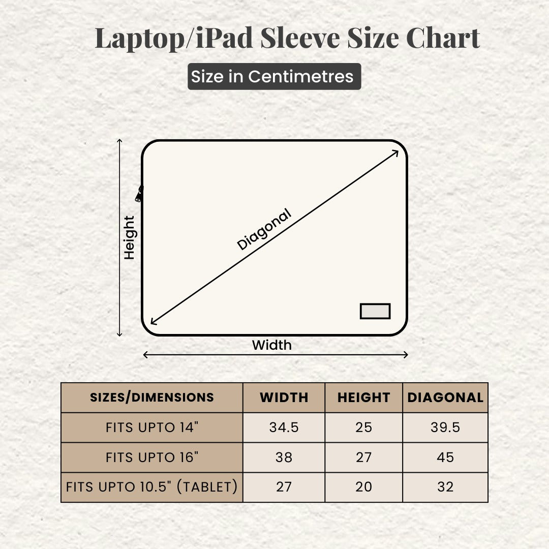 - 16-inch Laptop Sleeve: 38cm W x 27cm H x 2.5cm D