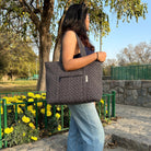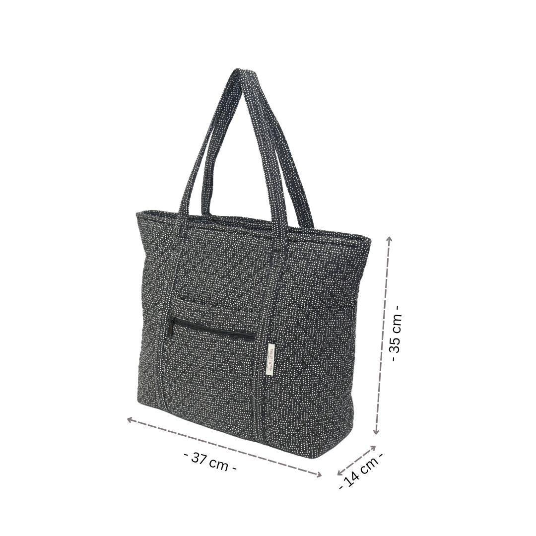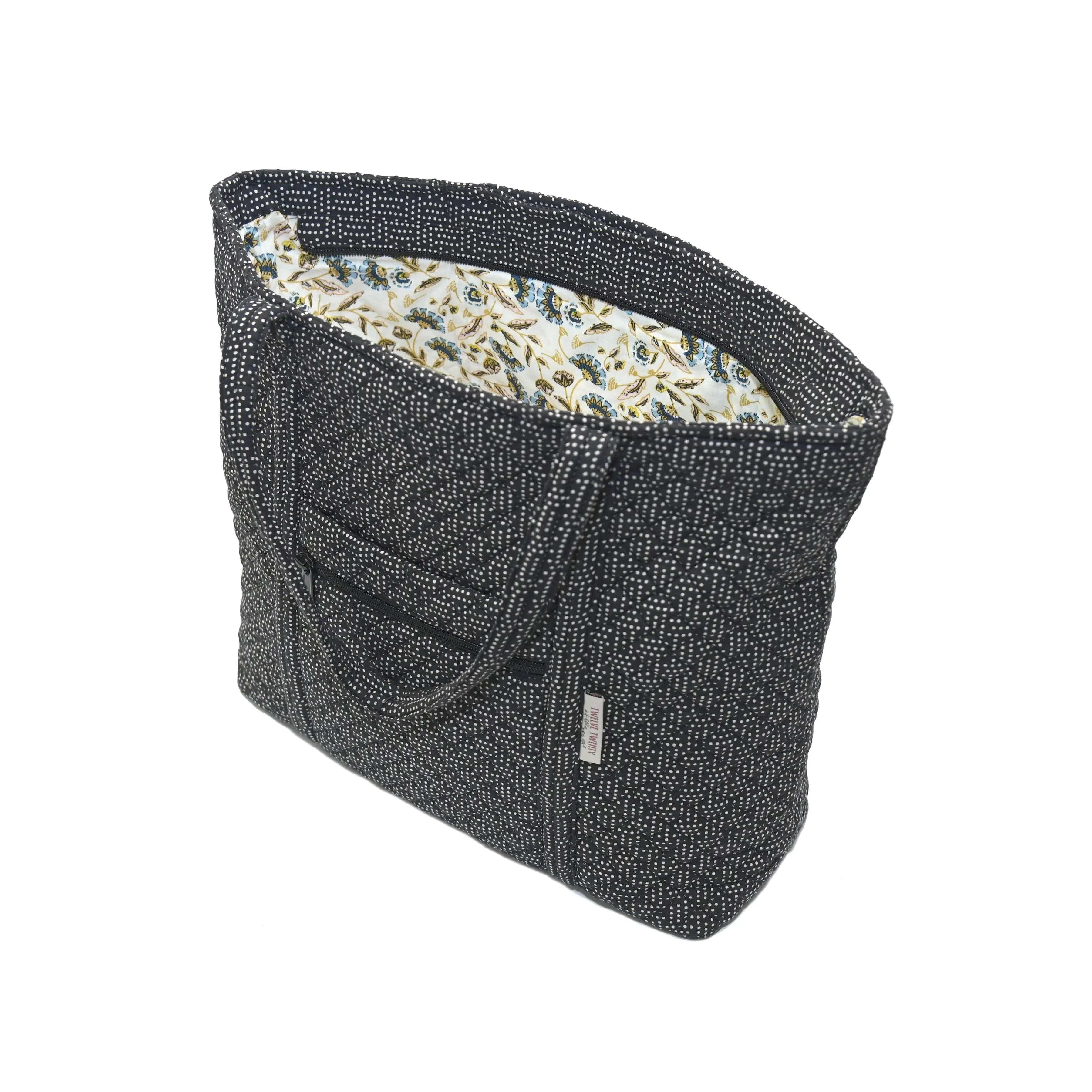 Quilted tote bag made from cotton fabric in vibrant prints and elegant solids with coordinated printed cotton lining. Zip, pullers, and all hardware used are of top export quality.