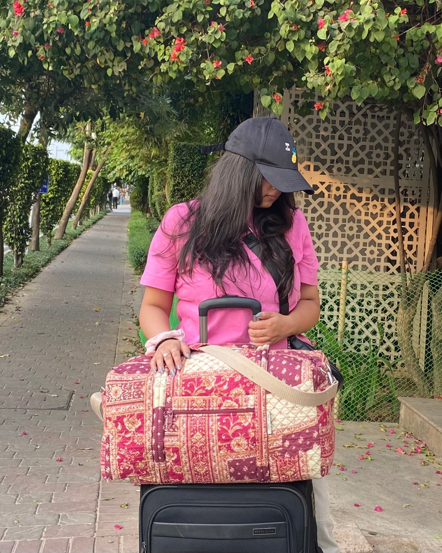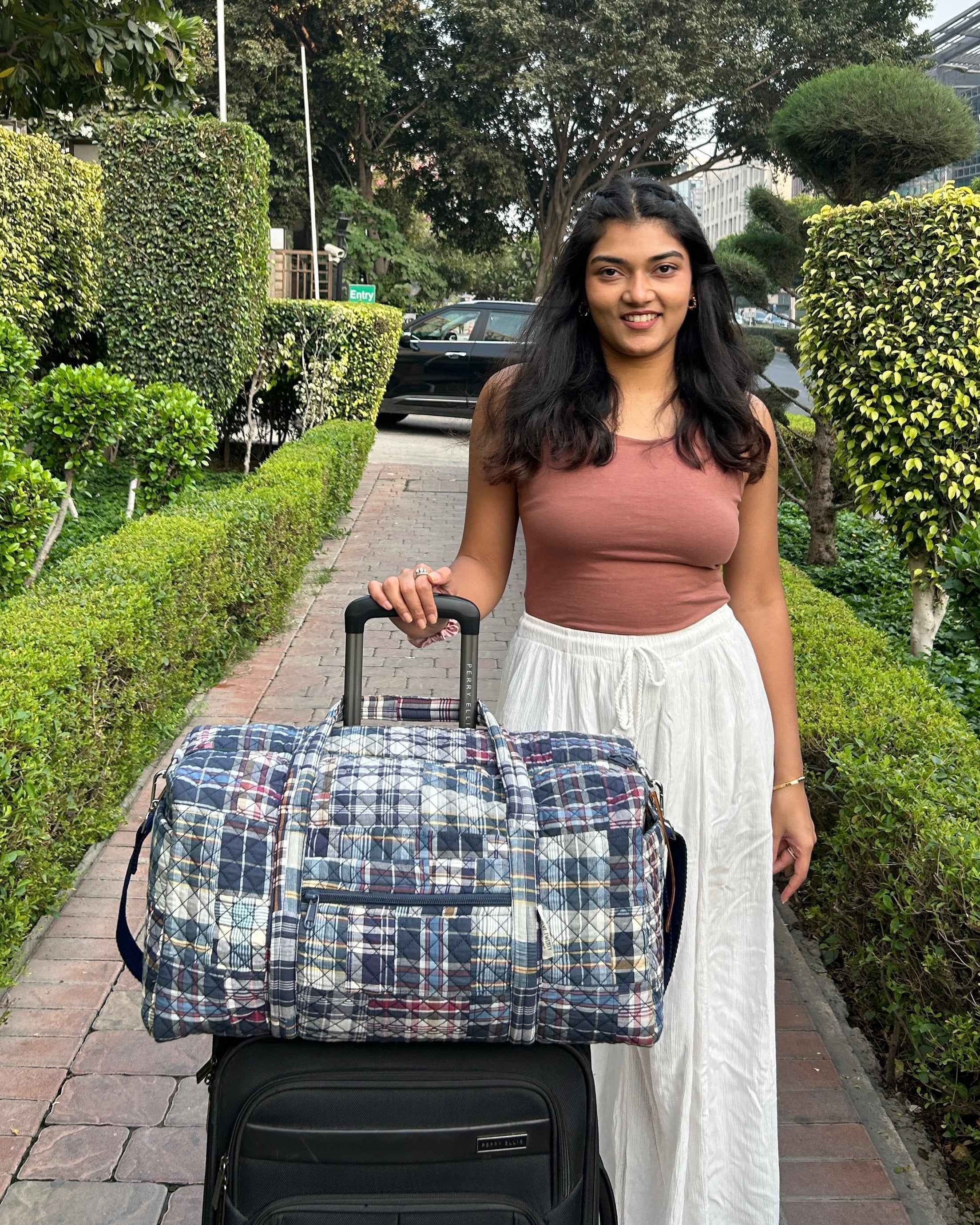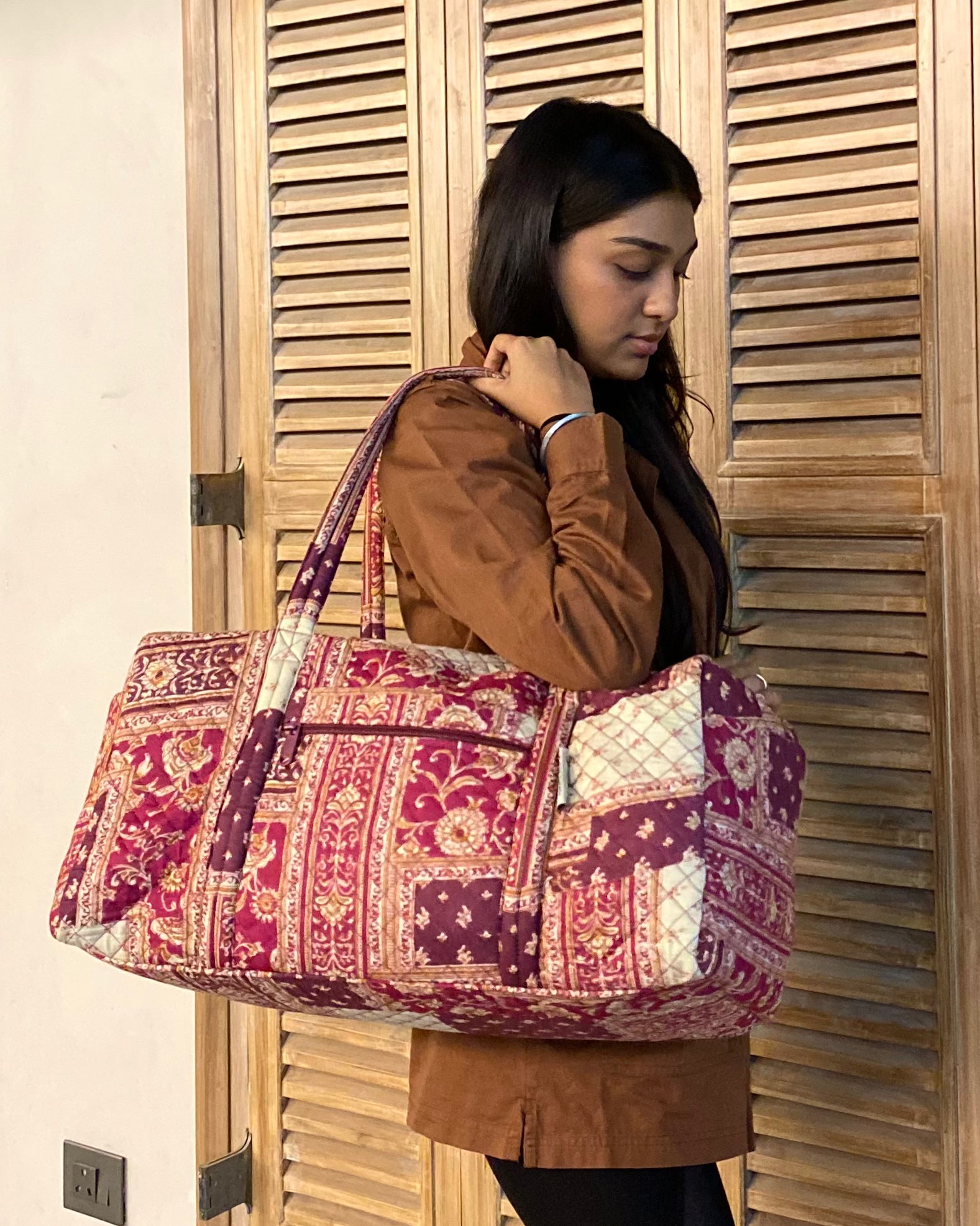 I can pack everything for my weekend trips in this Stylish mauve paisley duffle ! It’s super spacious !!